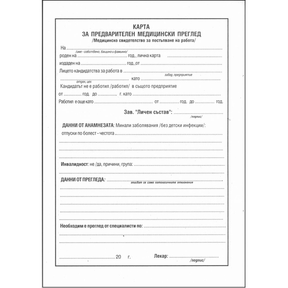 Карта за предварителен медицински преглед /Медицинско свидетелство за постъпване на работа/.